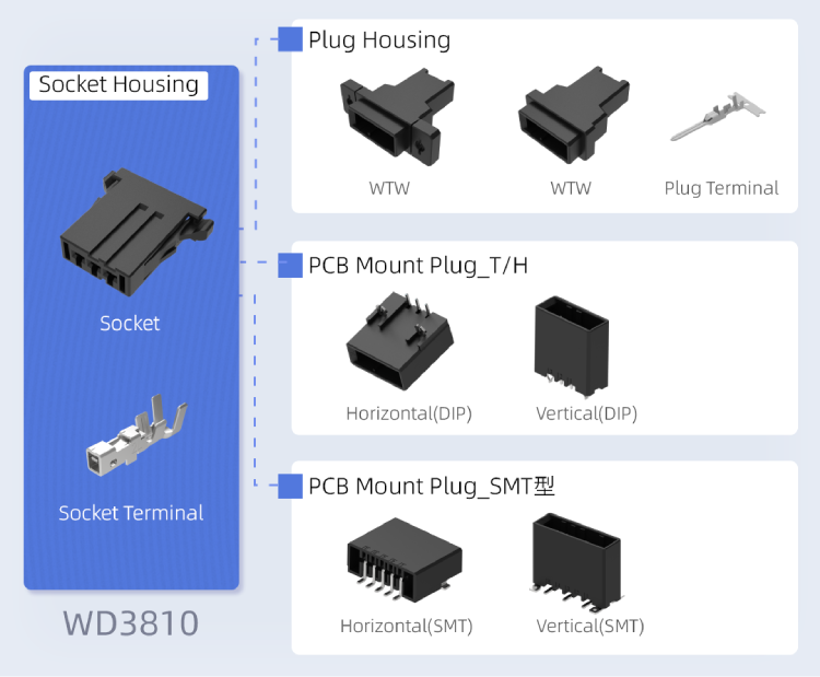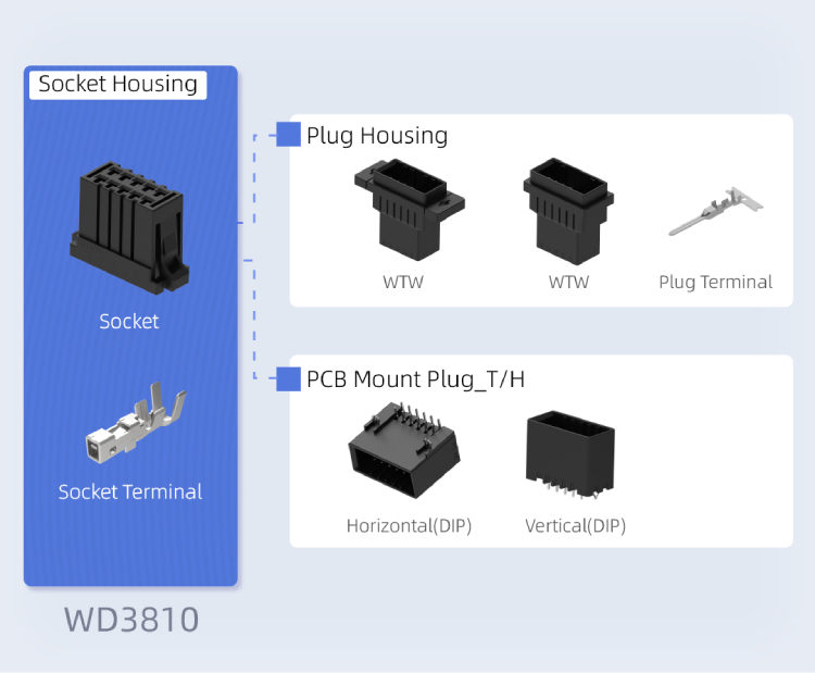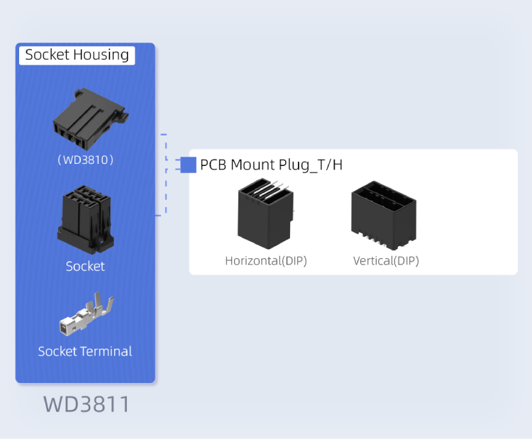 The WD3810 and WD3811 series are wire to board and wire to wire connectors. Featuring a compact 3.81 mm pitch and available in both vertical and horizontal cable exit orientations, these connectors are designed to accommodate high-density PCB layouts, facilitating device miniaturization.