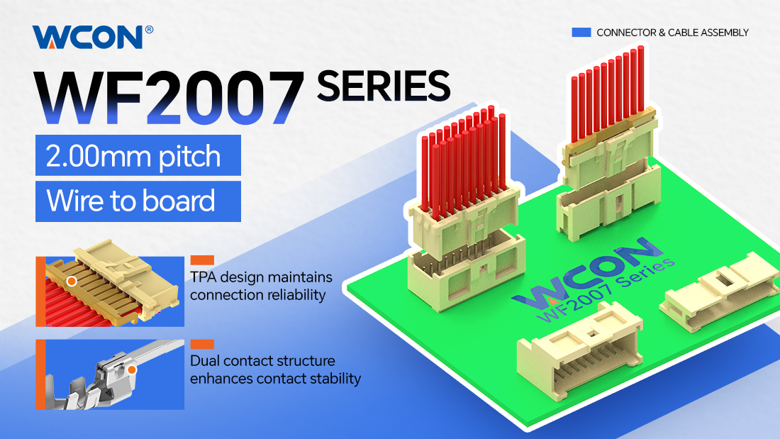 As automotive electronics and industrial automation systems demand ever-greater signal transmission reliability, high-density, vibration-resistant connectors with fine pitch have become critical. WCON Electronics' WF2007 series is a 2.00mm pitch high-density connector featuring single-row and dual-row designs for compact applications. Wire-end options include TPA terminals with secondary locking mechanisms, while dual-contact terminal design ensures stable connections.